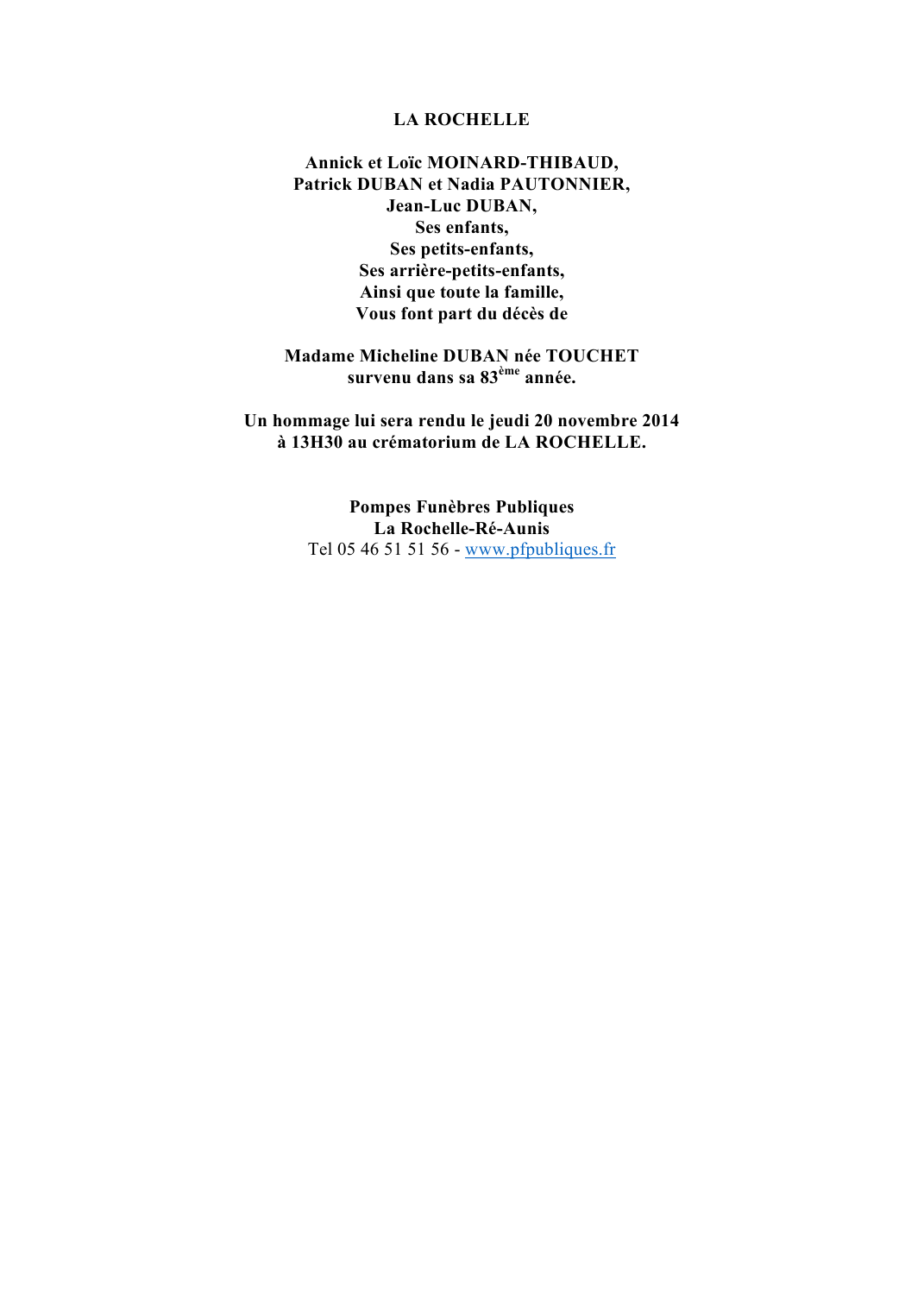 Madame Micheline DUBAN née TOUCHET