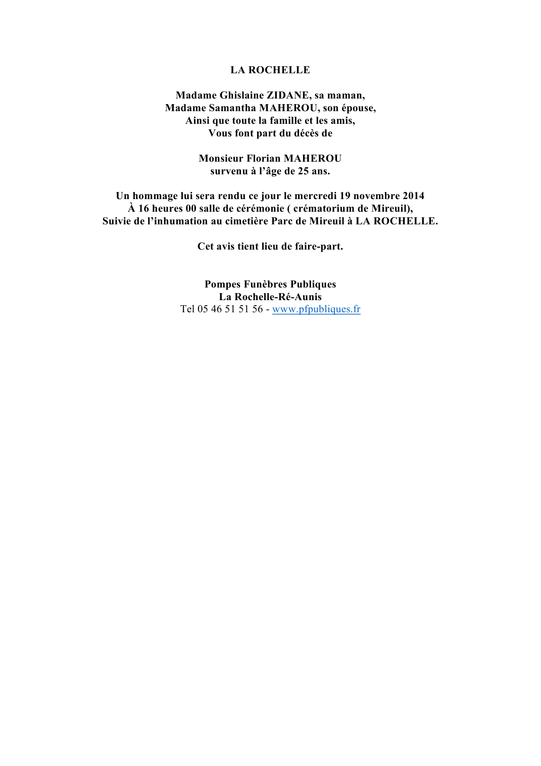 Décédé à Bouhet (17540, France) le vendredi 14 novembre 2014 à l'âge de 26 ans