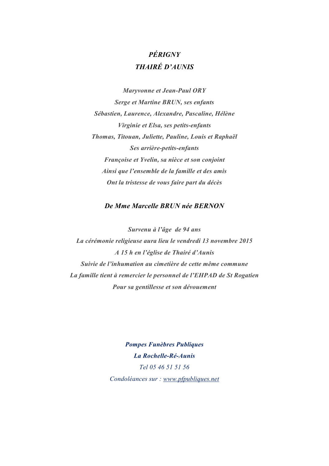 Décédée à Saint-Rogatien (17220, France) le dimanche 8 novembre 2015 à l'âge de 94 ans