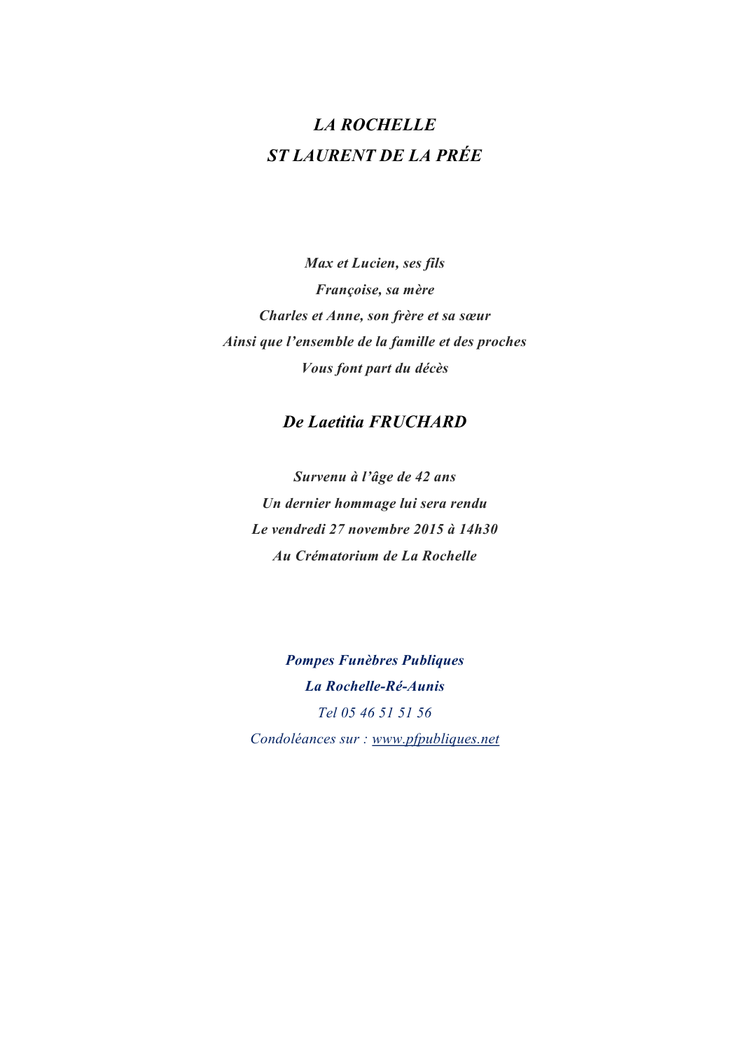 Décédée à La Rochelle (17000, France) le lundi 23 novembre 2015 à l'âge de 42 ans