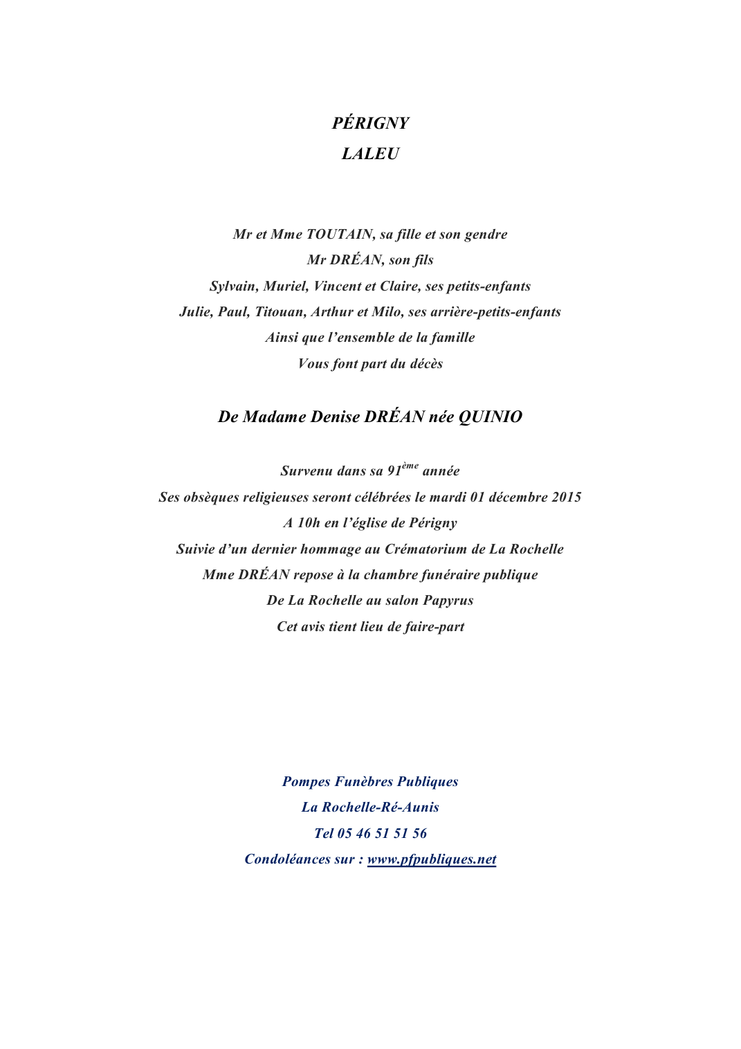 Décédée à Périgny (17180, France) le jeudi 26 novembre 2015 à l'âge de 90 ans