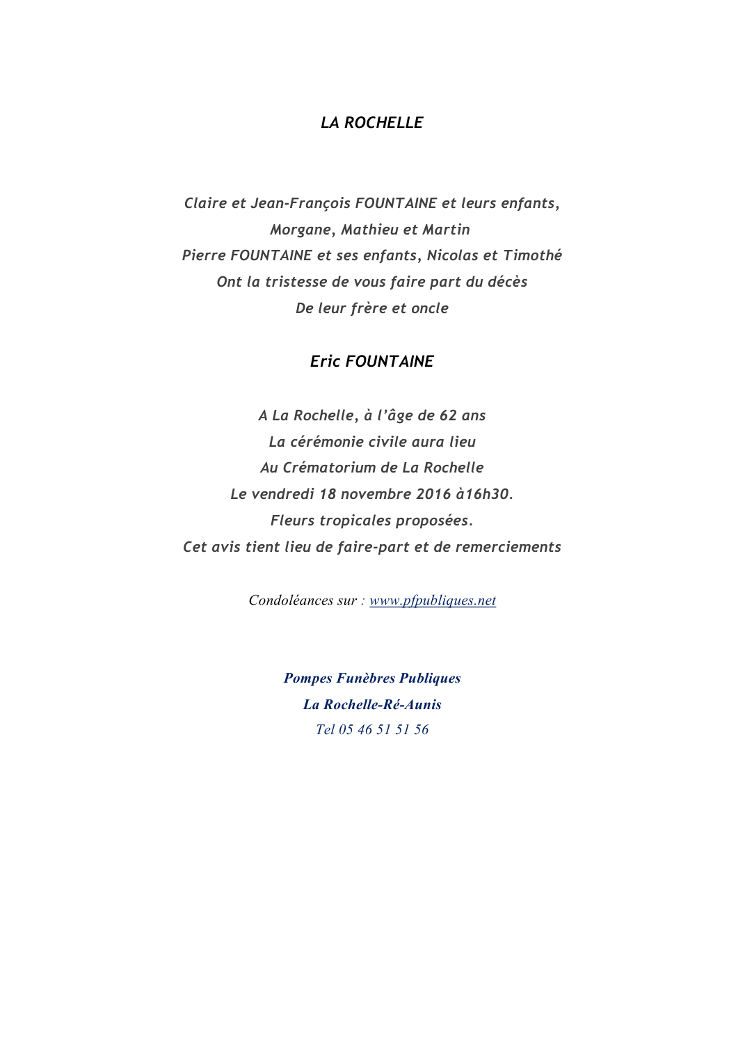 Décédé à La Rochelle (17000, France) le mardi 15 novembre 2016 à l'âge de 62 ans