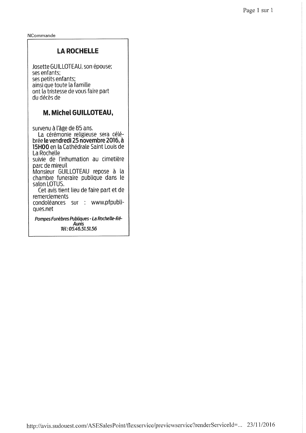 Décédé à Lagord (17140, France) le mardi 22 novembre 2016 à l'âge de 85 ans