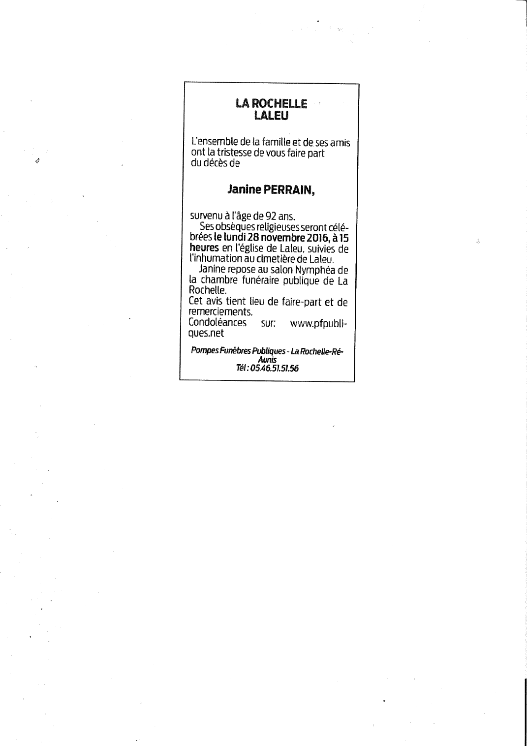 Décédée à La Rochelle (17000, France) le mercredi 23 novembre 2016 à l'âge de 92 ans