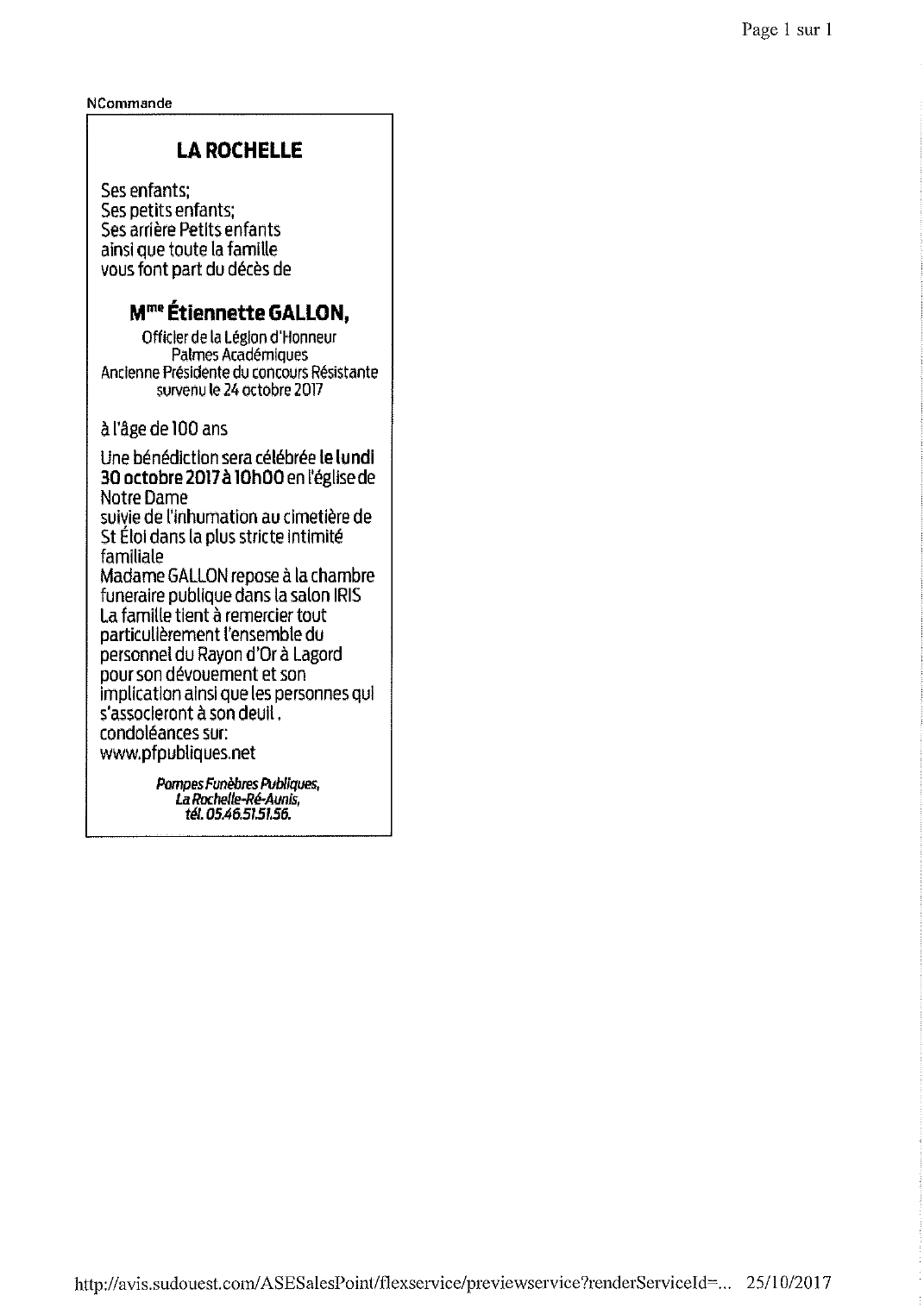 Décédée à Lagord (17140, France) le mardi 24 octobre 2017 à l'âge de 100 ans