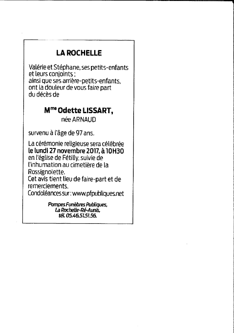 Décédée à La Rochelle (17000, France) le lundi 20 novembre 2017 à l'âge de 97 ans