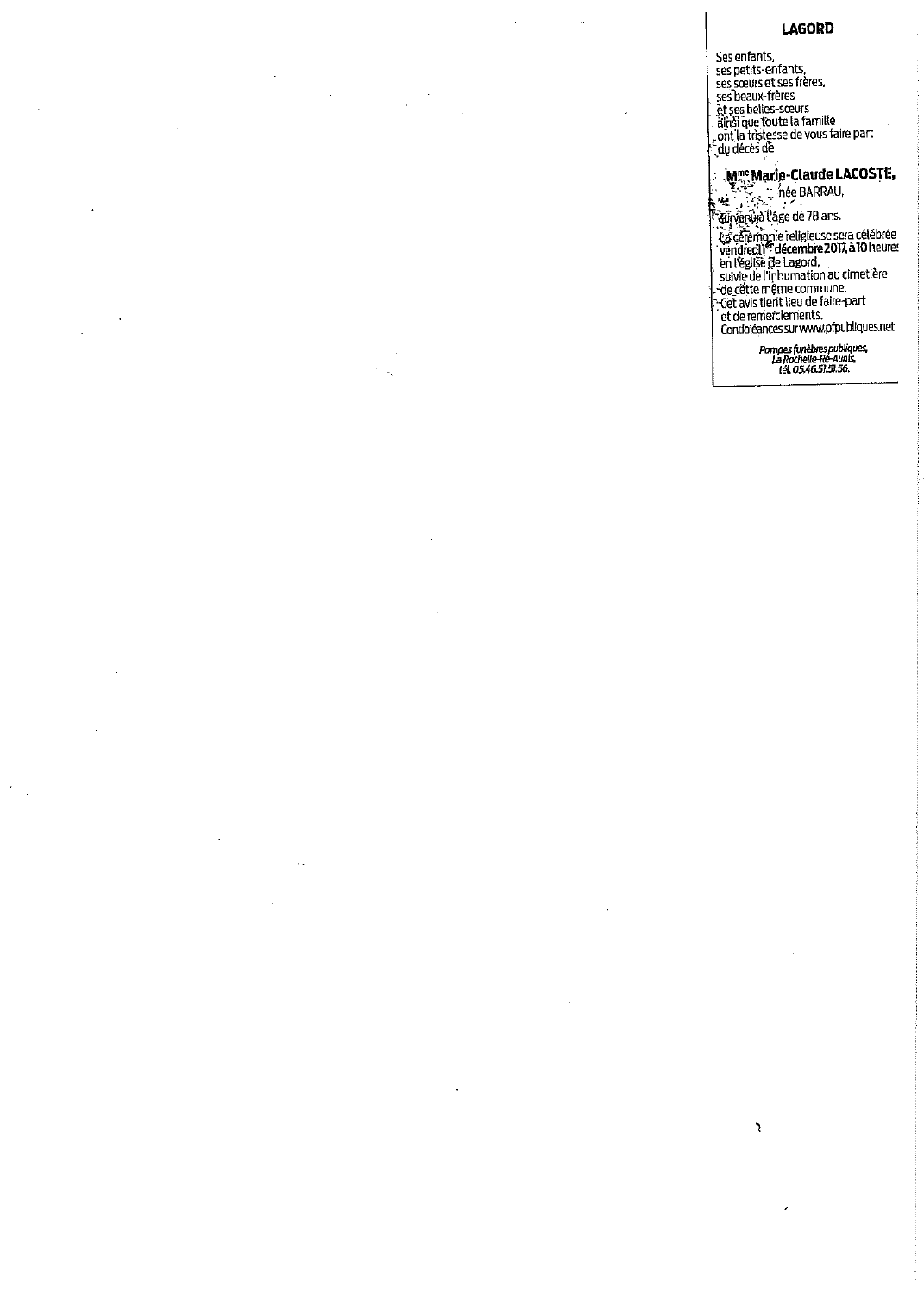 Décédée à Lagord (17140, France) le mercredi 22 novembre 2017 à l'âge de 78 ans