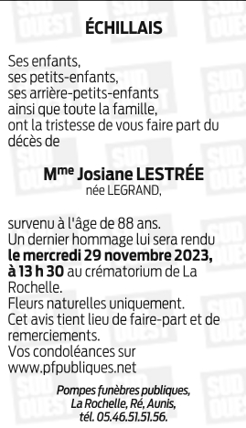 Décédée à Rochefort (17300, France) le mercredi 22 novembre 2023 à l'âge de 88 ans