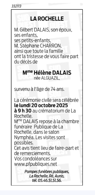 Décédée à La Rochelle (17000, France) le vendredi 10 octobre 2025 à l'âge de 73 ans