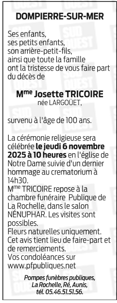 Décédée à Lagord (17140, France) le jeudi 30 octobre 2025 à l'âge de 100 ans