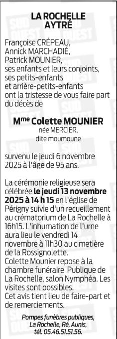 Décédée à La Rochelle (17000, France) le jeudi 6 novembre 2025 à l'âge de 95 ans