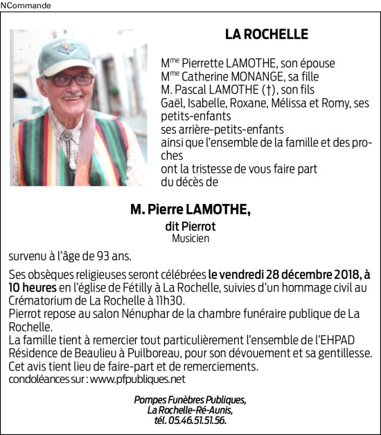 Décédé à Puilboreau (17138, France) le vendredi 21 décembre 2018 à l'âge de 93 ans