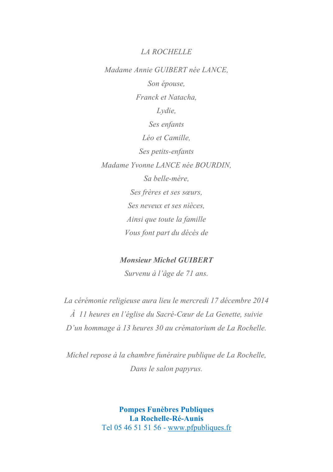 Décédé à Puilboreau (17138, France) le samedi 13 décembre 2014 à l'âge de 71 ans