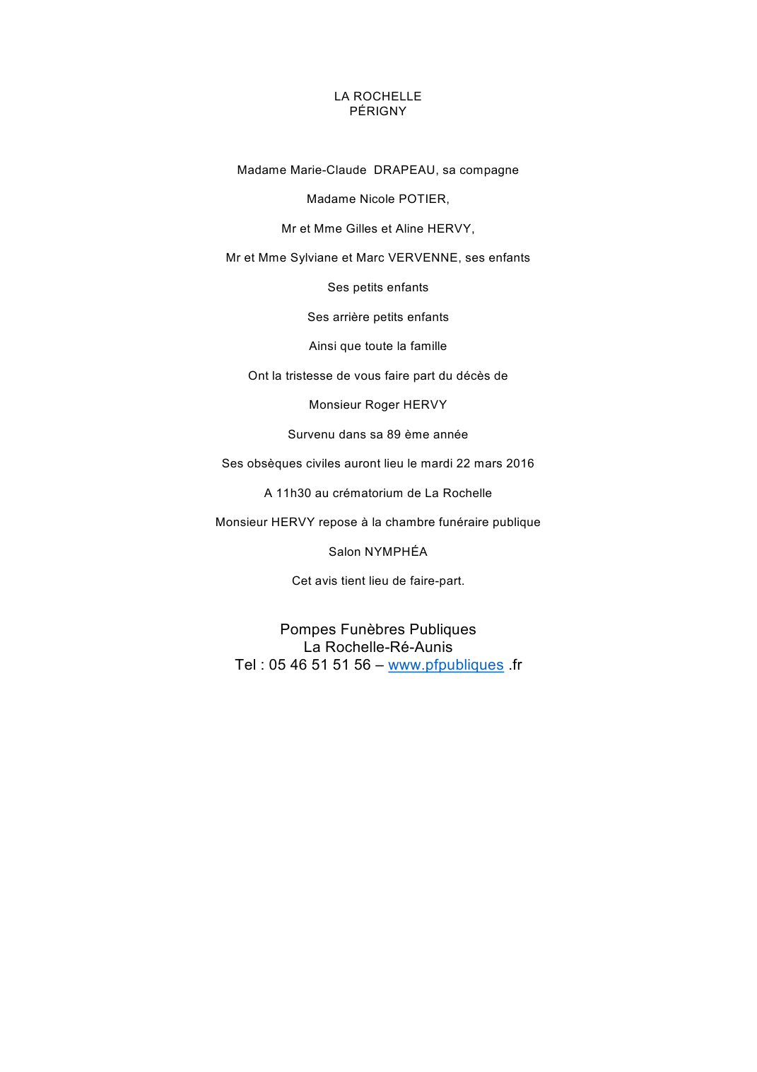 Décédé à Puilboreau (17138, France) le mardi 15 mars 2016 à l'âge de 88 ans