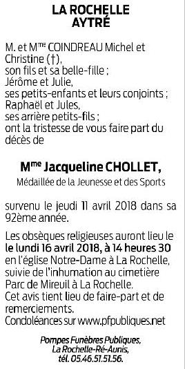 Décédée à La Rochelle (17000, France) le mercredi 11 avril 2018 à l'âge de 91 ans