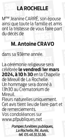 Décédé à La Rochelle (17000, France) le samedi 24 février 2024 à l'âge de 92 ans