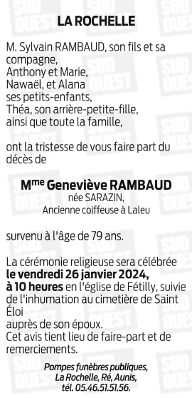 Décédée à La Rochelle (17000, France) le lundi 22 janvier 2024 à l'âge de 79 ans