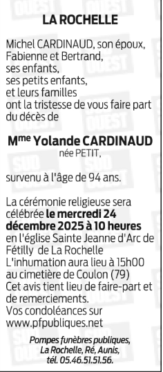 Décédée à La Rochelle (17000, France) le lundi 15 décembre 2025 à l'âge de 94 ans