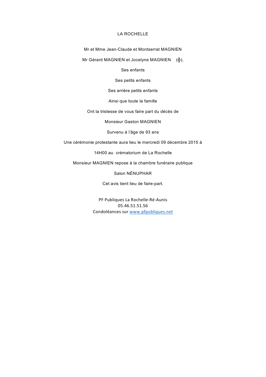 Décédé à Périgny (17180, France) le dimanche 6 décembre 2015 à l'âge de 93 ans