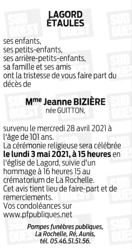 Décédée à Etaules (17750, France) le mercredi 28 avril 2021 à l'âge de 101 ans