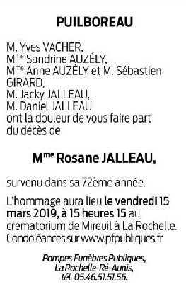 Décédée à La Rochelle (17000, France) le samedi 9 mars 2019 à l'âge de 71 ans