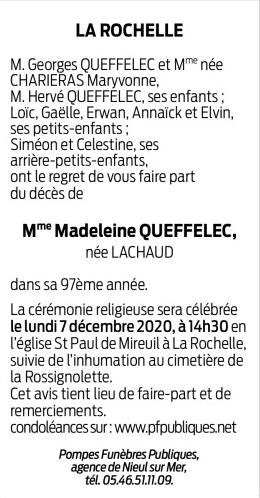 Madame Madeleine QUEFFELEC née LACHAUD