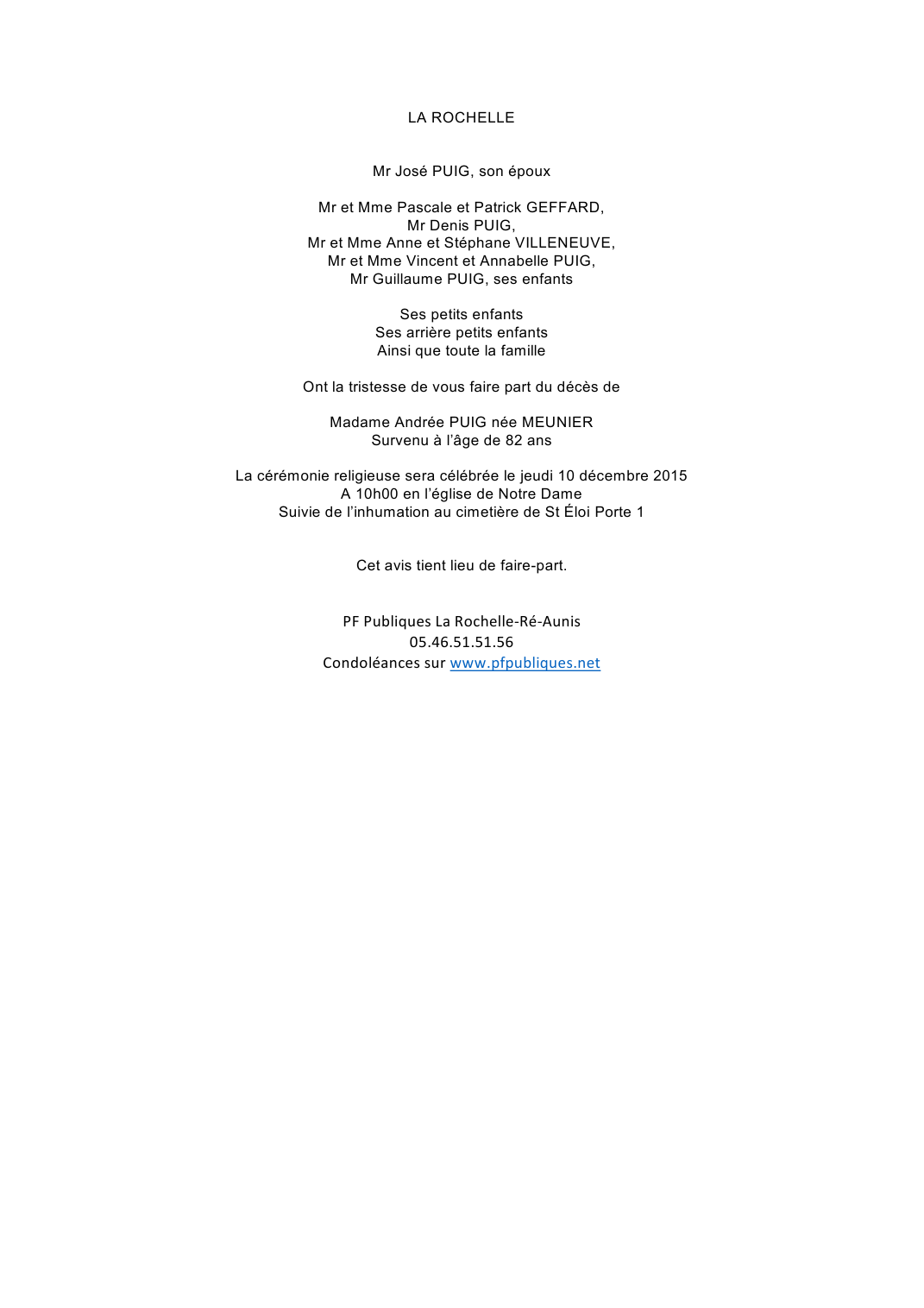 Décédée à Chambon (17290, France) le dimanche 6 décembre 2015 à l'âge de 82 ans