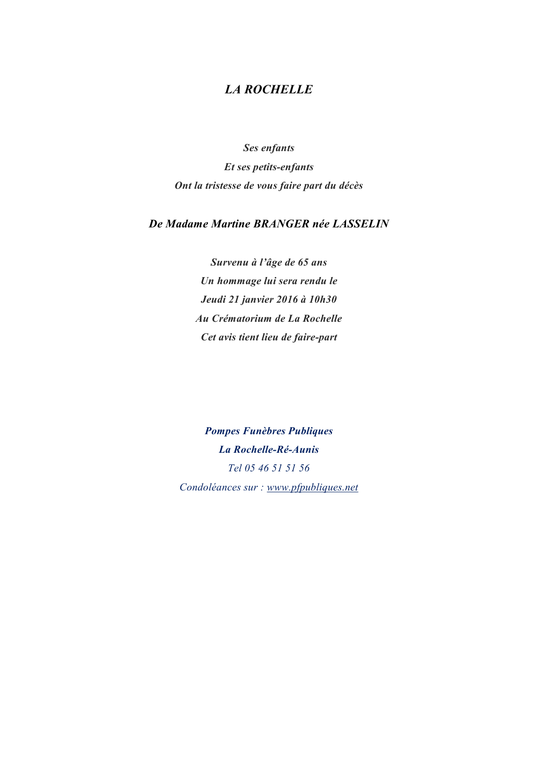 Décédée à La Rochelle (17000, France) le samedi 16 janvier 2016 à l'âge de 65 ans
