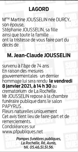 Décédé à La Rochelle (17000, France) le vendredi 1 janvier 2021 à l'âge de 74 ans