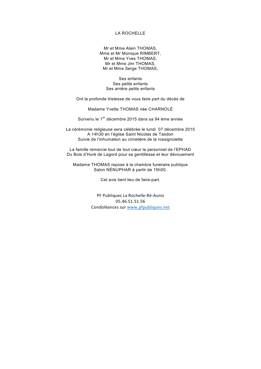 Décédée à Lagord (17140, France) le mardi 1 décembre 2015 à l'âge de 93 ans