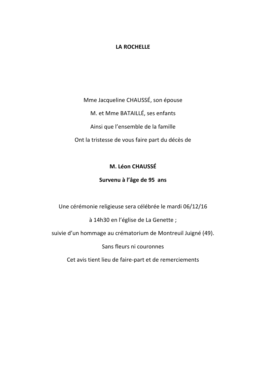 Décédé à La Rochelle (17000, France) le samedi 3 décembre 2016 à l'âge de 95 ans