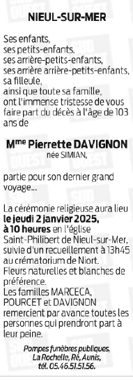 Décédée à Nieul-sur-Mer (17137, France) le jeudi 26 décembre 2024 à l'âge de 103 ans