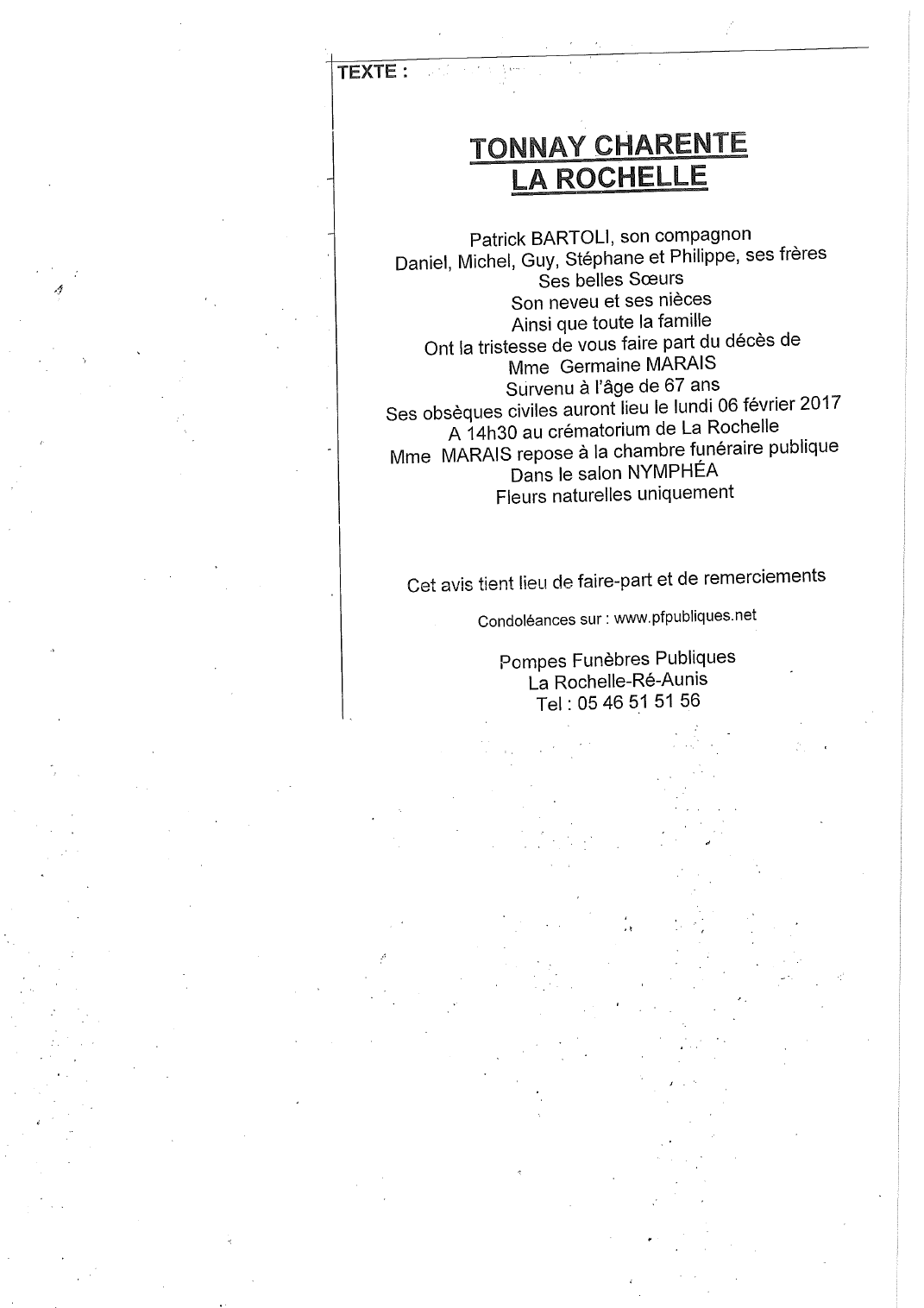 Décédée à La Rochelle (17000, France) le mercredi 1 février 2017 à l'âge de 67 ans