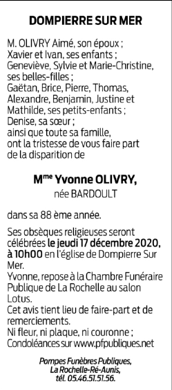 Décédée à La Rochelle (17000, France) le jeudi 10 décembre 2020 à l'âge de 87 ans