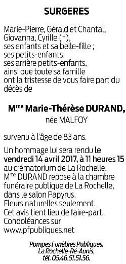 Madame Marie-Thérèse DURAND née MALFOY