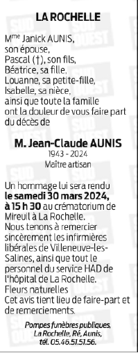 Décédé à Chambon (17290, France) le mercredi 20 mars 2024 à l'âge de 80 ans