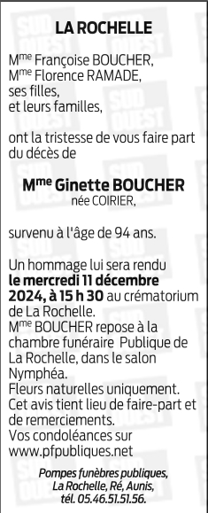 Décédée à La Rochelle (17000, France) le mardi 3 décembre 2024 à l'âge de 94 ans