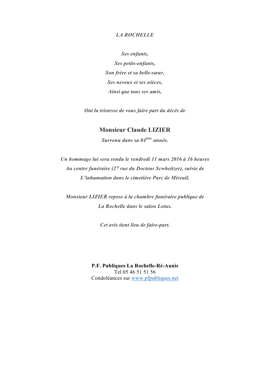Veuf de Madame Suzanne LIZIER