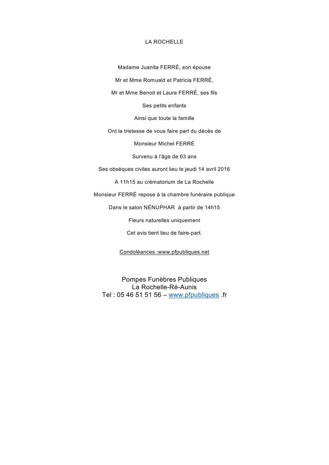 Décédé à La Rochelle (17000, France) le vendredi 8 avril 2016 à l'âge de 63 ans