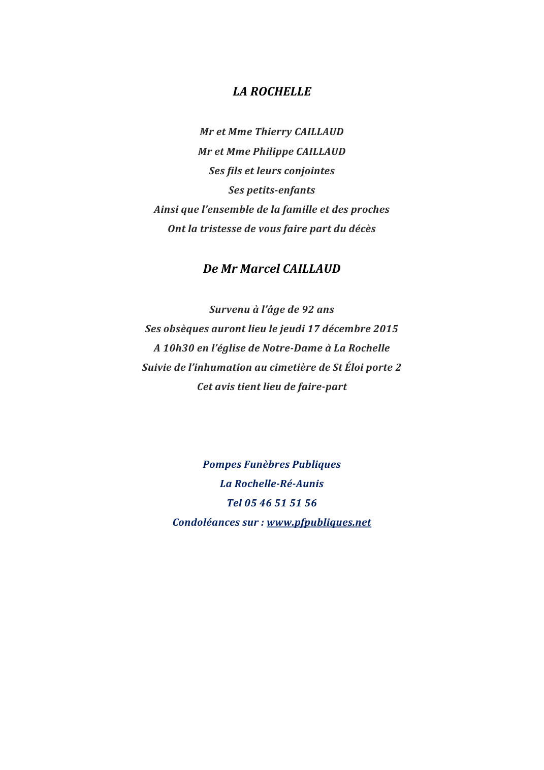 Décédé à La Rochelle (17000, France) le samedi 12 décembre 2015 à l'âge de 92 ans
