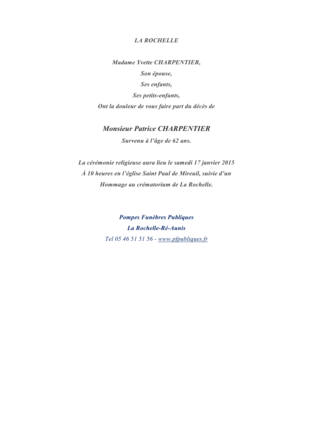 Décédé à La Rochelle (17000, France) le lundi 12 janvier 2015 à l'âge de 62 ans
