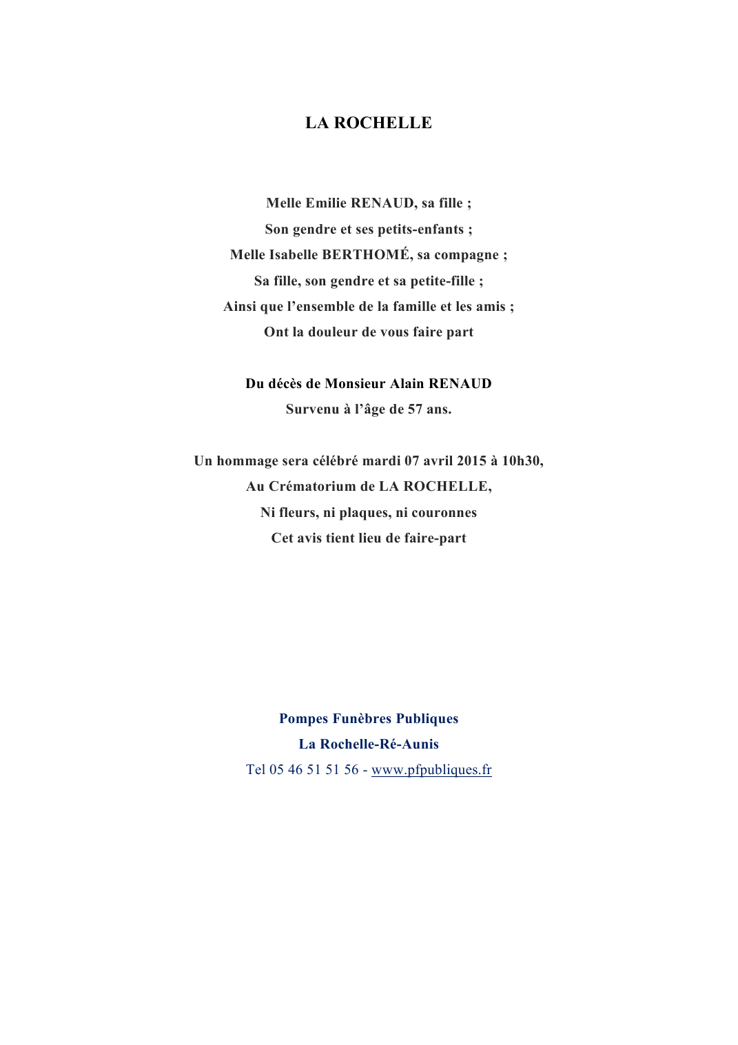 Décédé à La Rochelle (17000, France) le mardi 31 mars 2015 à l'âge de 57 ans