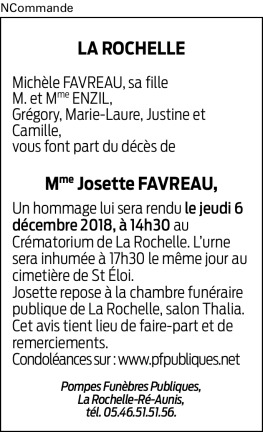 Décédée à La Rochelle (17000, France) le jeudi 29 novembre 2018 à l'âge de 91 ans