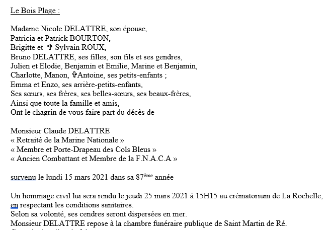 Décédé à La Rochelle (17000, France) le lundi 15 mars 2021 à l'âge de 86 ans