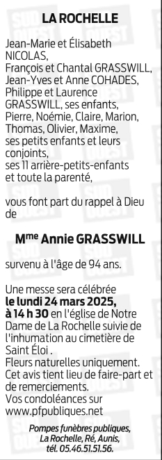 Décédée à La Rochelle (17000, France) le dimanche 16 mars 2025 à l'âge de 94 ans
