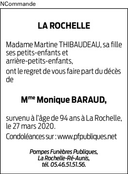 Décédée à La Rochelle (17000, France) le vendredi 27 mars 2020 à l'âge de 94 ans