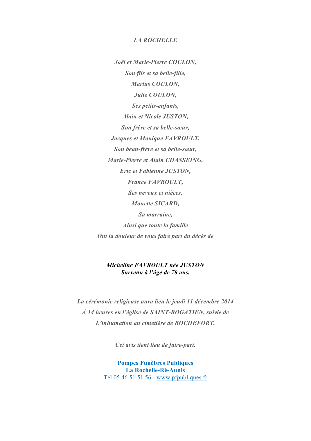 Décédée à Saint-Rogatien (17220, France) le samedi 6 décembre 2014 à l'âge de 78 ans
