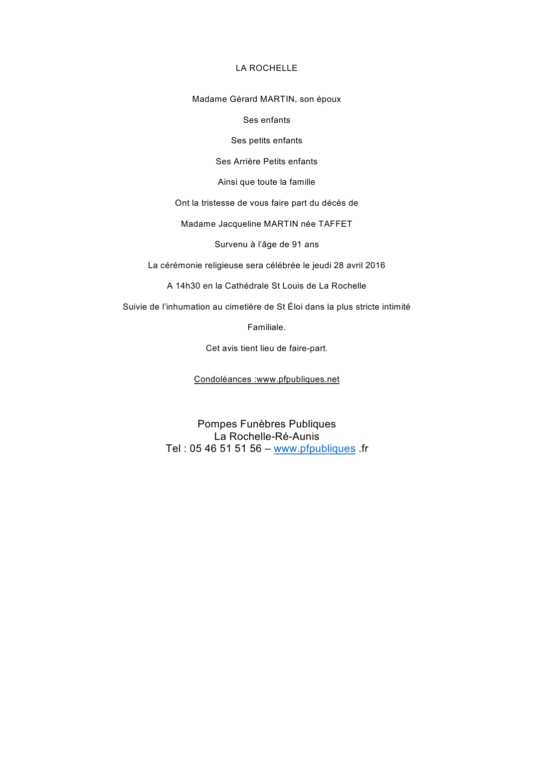 Décédée à L'Houmeau (17137, France) le jeudi 21 avril 2016 à l'âge de 91 ans