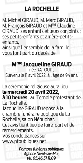 Décédée à Nieul-sur-Mer (17137, France) le lundi 11 avril 2022 à l'âge de 94 ans