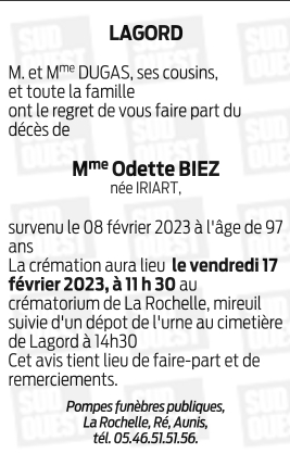 Madame Odette BIEZ née IRIART